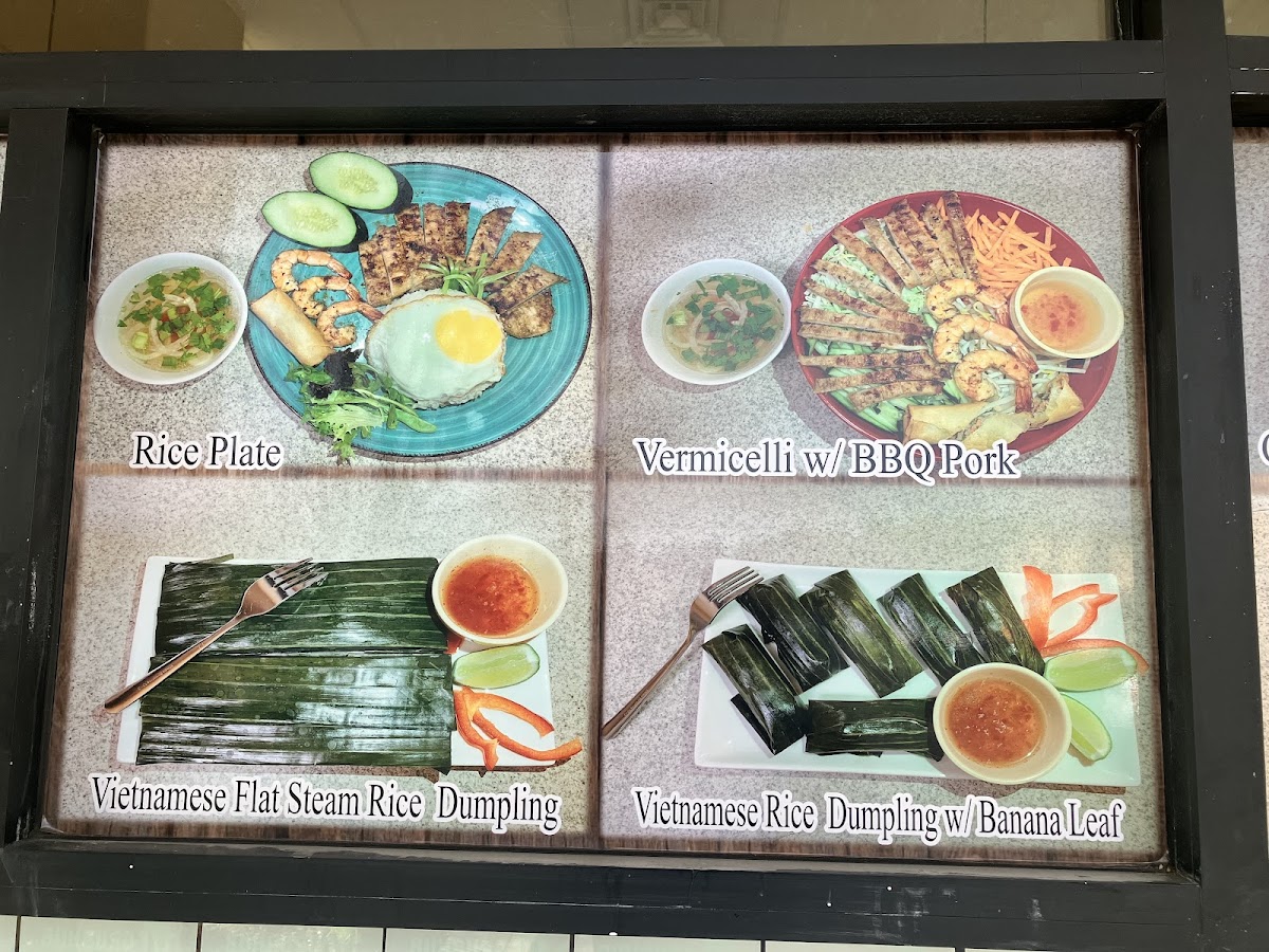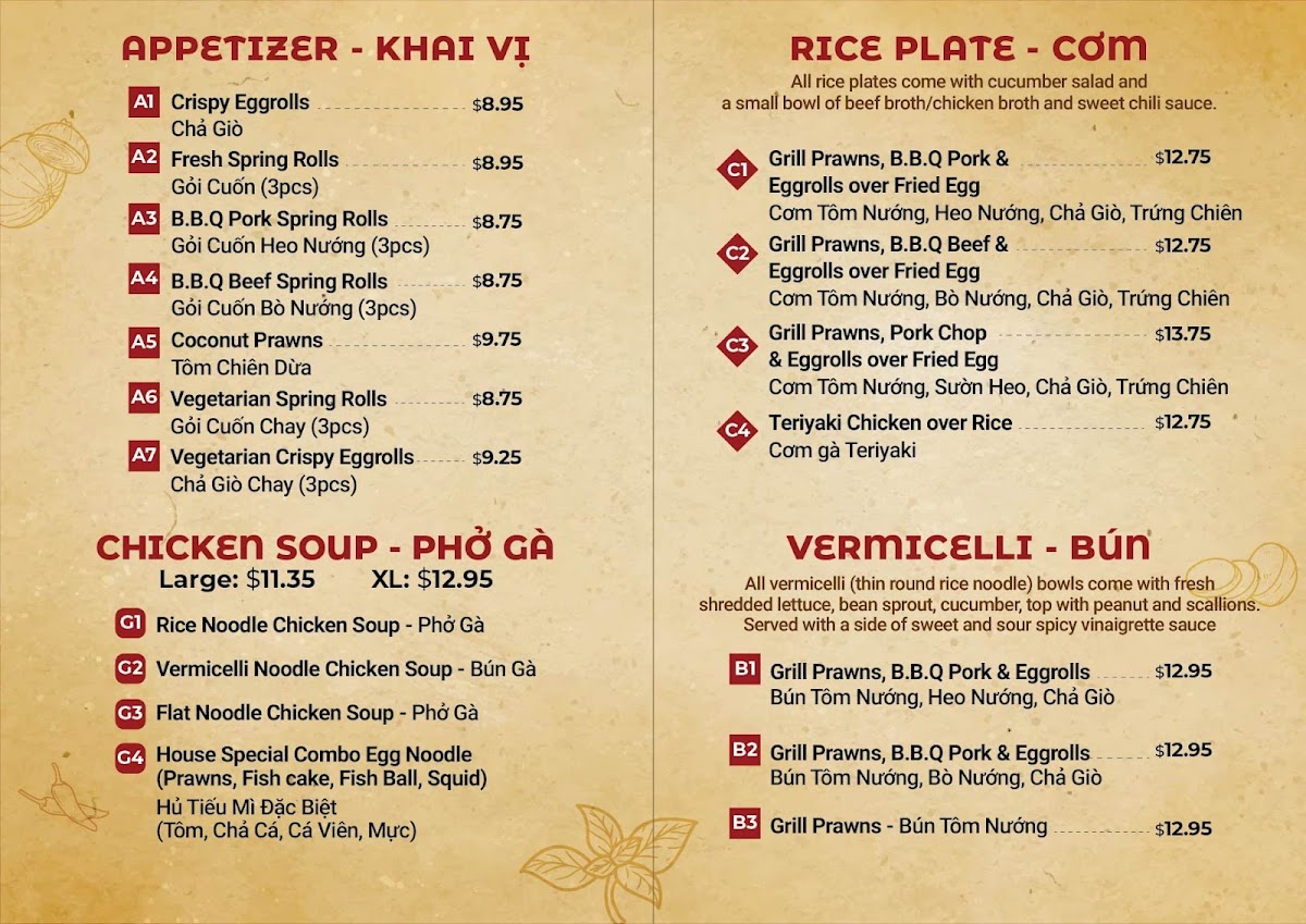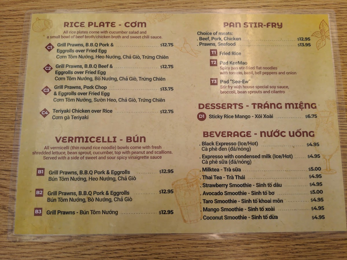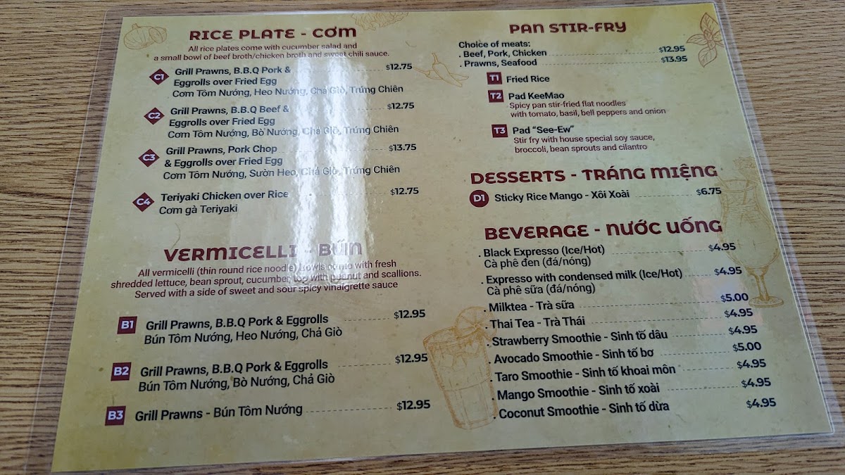 Grilled prawns, BBQ pork, and eggrolls atop a fried egg, served with rice. Choice of beef or chicken broth.