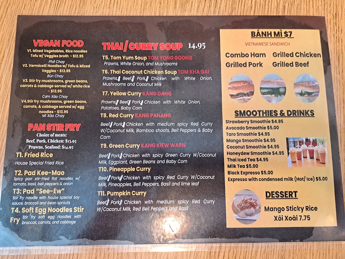 Pan stir-fried rice with choice of beef, pork, chicken, prawns, or seafood.
