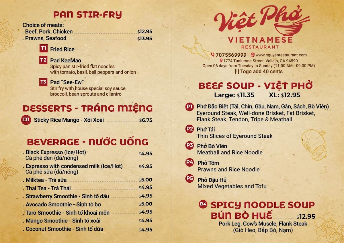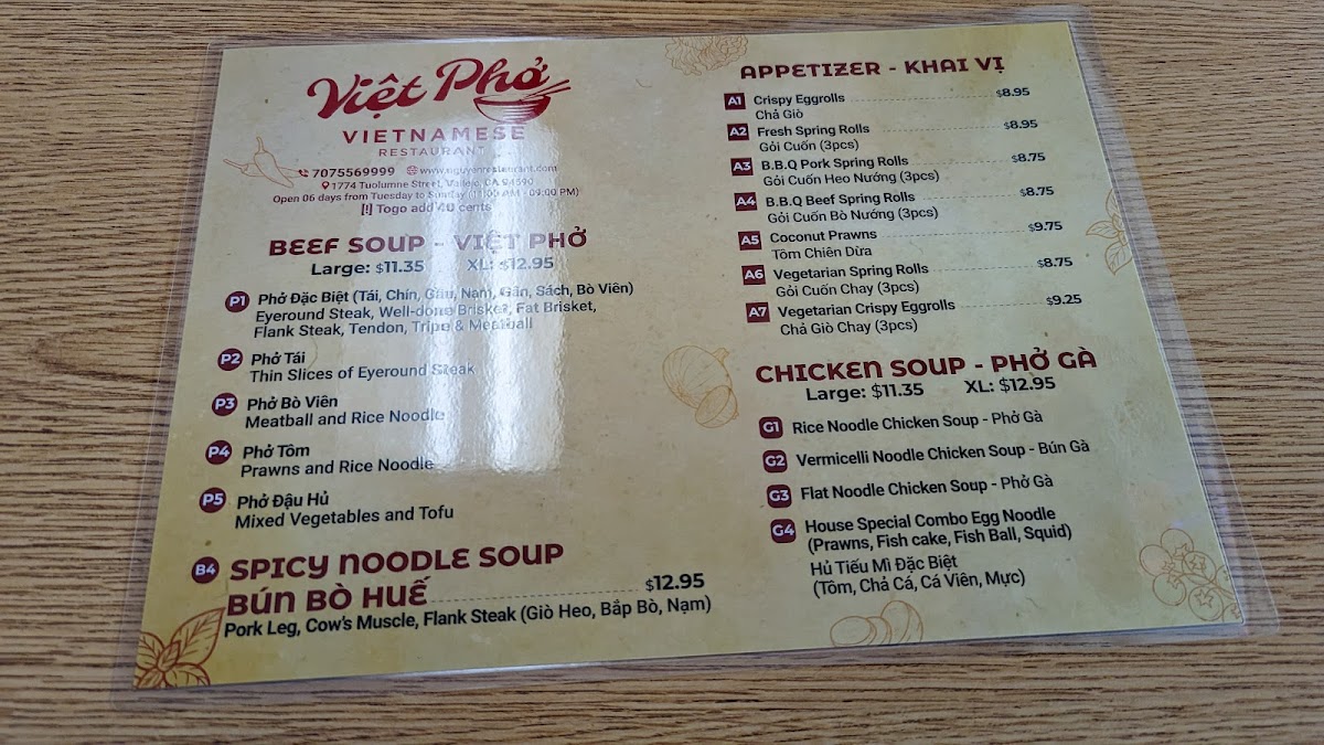 Vietnamese Phở Tái: Thinly sliced eyeround steak in a rich broth. Options include large or extra large.